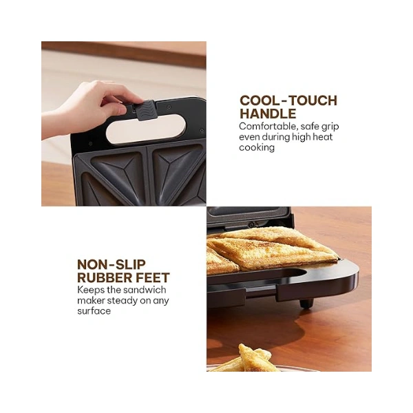 Cool-Touch Body with Anti-Slip Base: Heat-resistant body and handle prevent burns, while non-slip rubber feet keep the sandwich maker steady and secure during use.