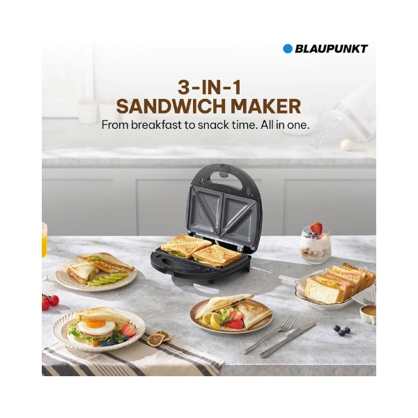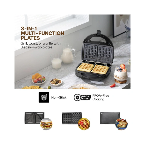 3-in-1 Multi-Function Sandwich Maker: Includes 3 interchangeable non-stick plates for grilling, sandwich toasting, and waffle making—perfect for breakfast, snacks, or light meals at home.