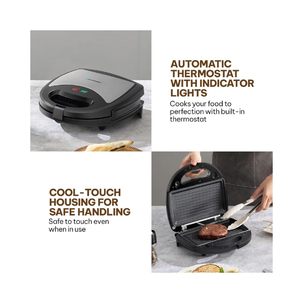 Cool-Touch Body & Indicator Lights: The heat-resistant outer body and handle ensure safe operation, while power and ready indicator lights offer easy, controlled cooking.