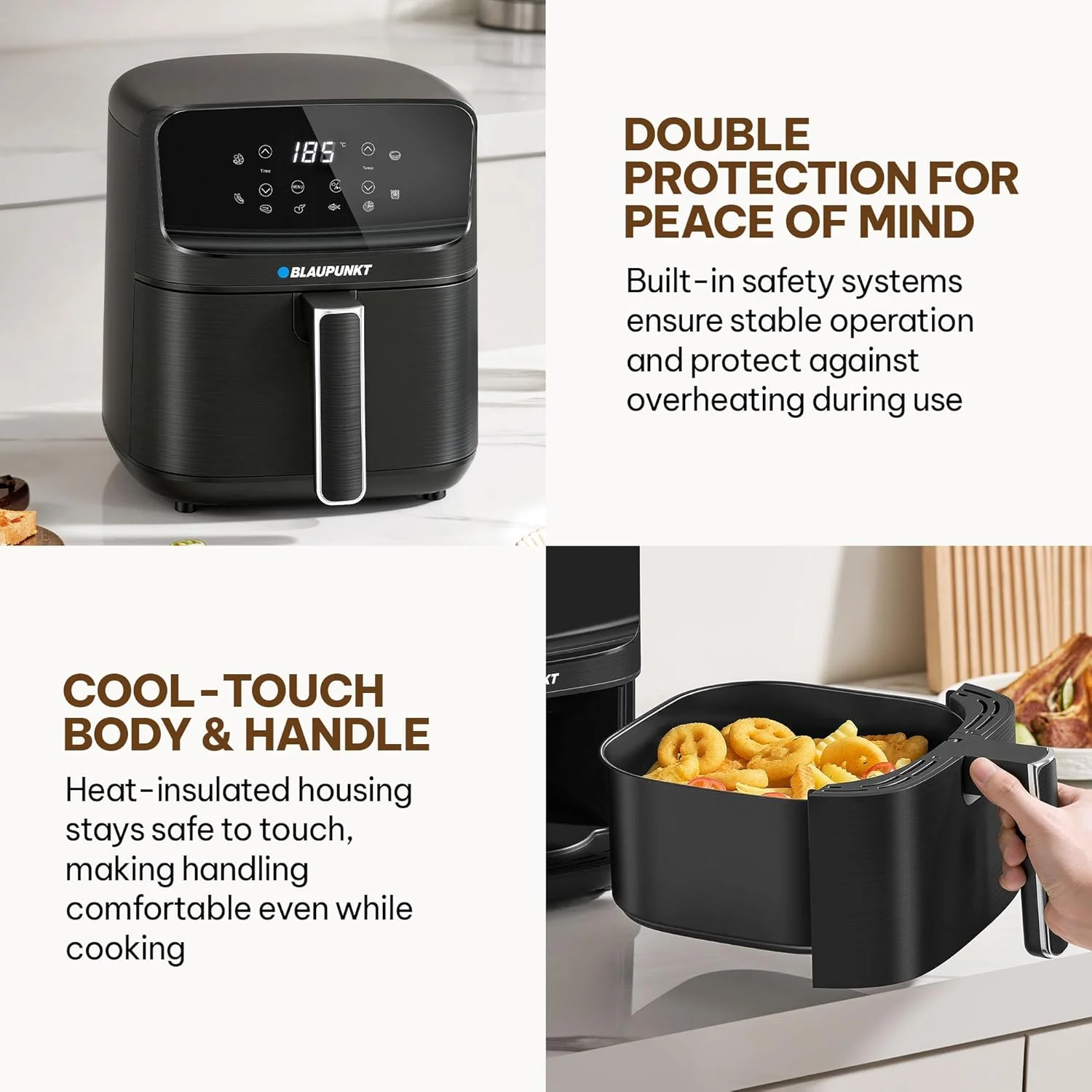 Built with safety and convenience in mind, it features a cool-touch housing and handle, preventing burns during use, along with a double protection system for added safety. Its sleek and compact design fits perfectly into any modern kitchen.