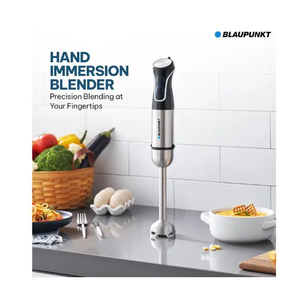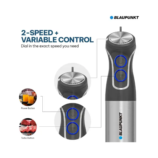 Variable Speed with 2 Speed Settings: Blaupunkt immersion hand blender offers 2 preset speeds and a variable speed dial, letting you adjust blending intensity for smoothies, sauces, baby food, or purees.