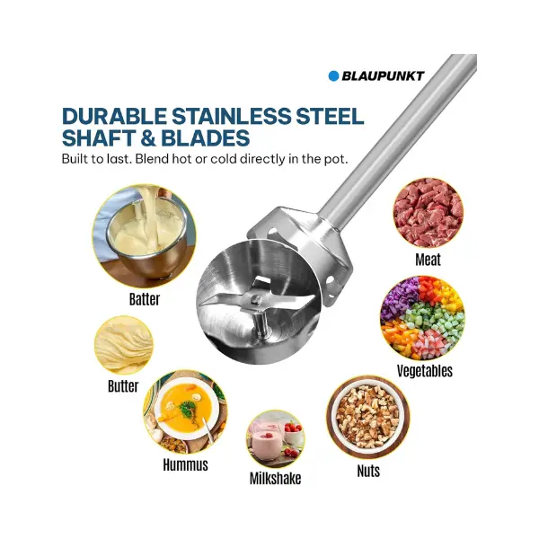 High Power 1000W Copper Motor: Blaupunkt Hand Blender 1000W delivers strong and consistent performance to blend soups, smoothies, sauces, purees, and even tough ingredients like nuts, ice, or meat.