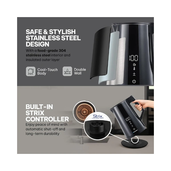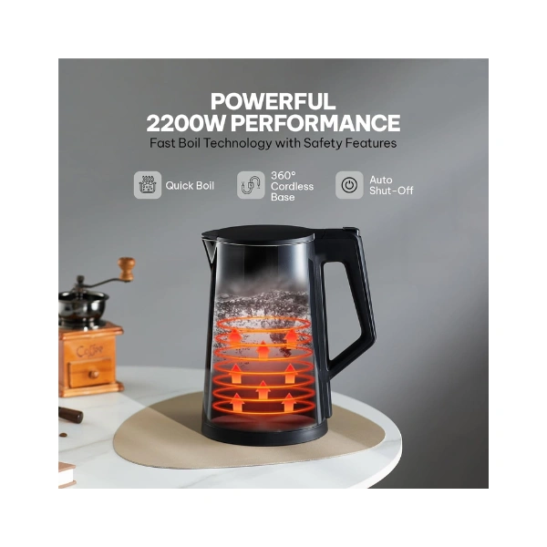 Powerful 2200W Fast Boiling: High-performance heating element ensures quick boiling. Large 1.7L cordless kettle with 360° swivel base and Strix controller for convenience and safety.