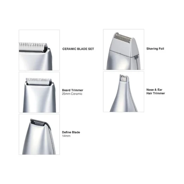 • 4 Blade Set + Foil & Nose Trimmer – Includes ceramic beard blade, define blade, foil blade, and nose/ear trimmer.